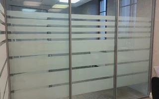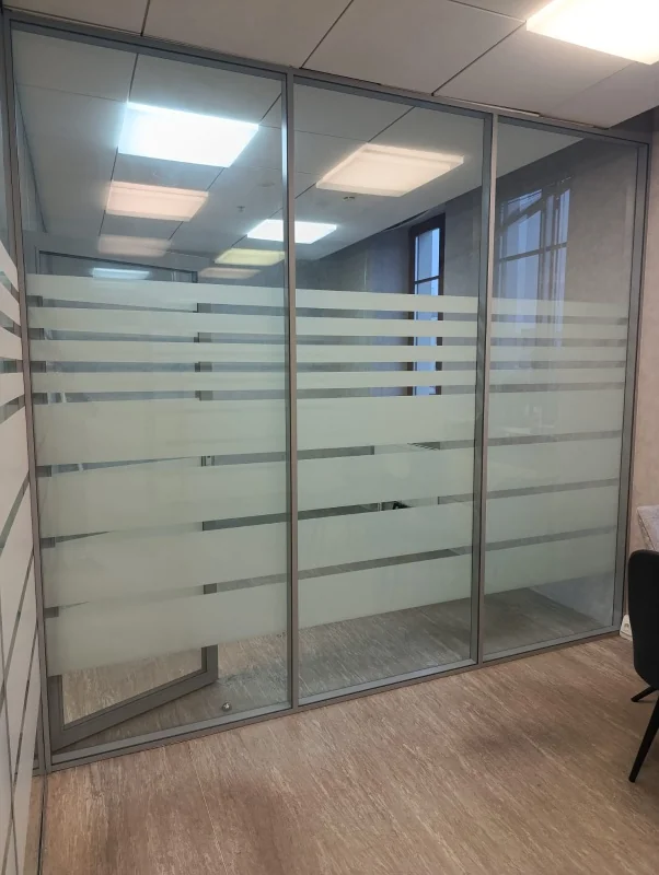 Использование декоративных матовых пленок на стеклянных перегородках — практичное и эстетичное решение для оформления офисных интерьеров.