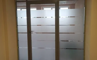 Сотрудники компании «СОЛАР ГЛАСС» закончили работы по установке пленки на входную дверь офиса строительной компании. Декоративная матовая пленка MATTE WHITE размещена в виде горизонтальных полос. Входная дверь выполнена из прозрачного стекла. Чтобы визуально отделить пространство, она была оклеена матовой пленкой.