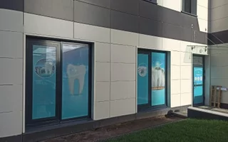 В новой стоматологической клинике сотрудники компании «СОЛАР ГЛАСС» завершили оклейку наружного остекления и входных дверей. В работе использовалась матовая декоративная плёнка с полноцветной печатью изображений с необходимой информацией. Пленку напечатали и наклеили точно по предоставленному дизайн-макету. Этот принцип оклейки окон является важным атрибутом рекламы для компании клиента.